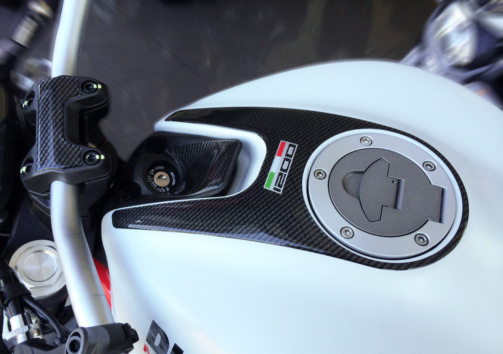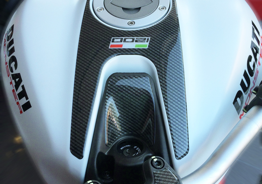 Si tratta di un Kit resinato ad effetto carbonio con personalizzazione 1200 o 821 che protegge tutta la zona attorno alla ghiera di rifornimento, la zona accensione e la piastra sopra il manubrio. L’effetto finale è al contempo fine e aggressivo.