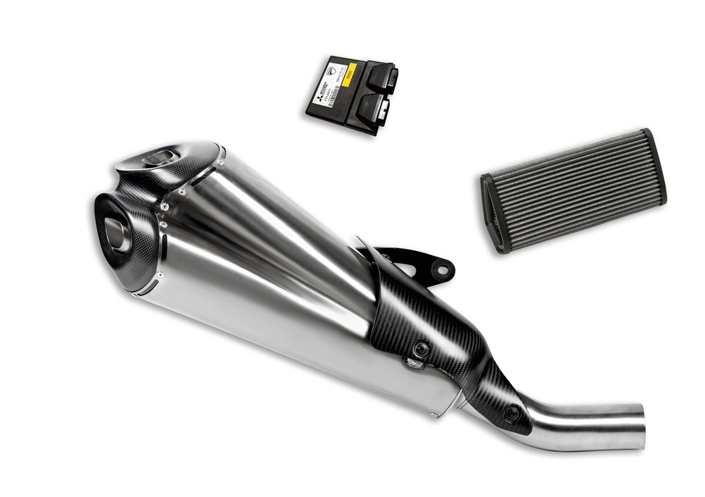 Kit silenziatore omologato in acciaio inox con fondello in fibra di carbonio. Il particolare design delle superfici e l'adozione di materiali pregiati, rende questo silenziatore un pezzo unico ed esclusivo. Prezzo al pubblico (Iva incl.) 1748.00 Euro.