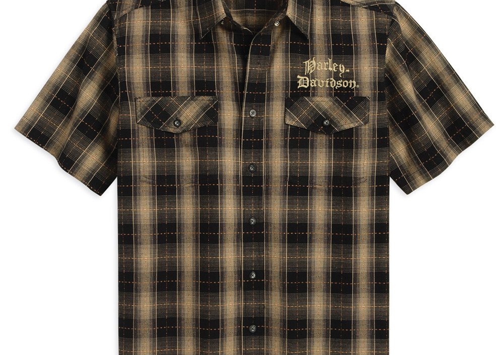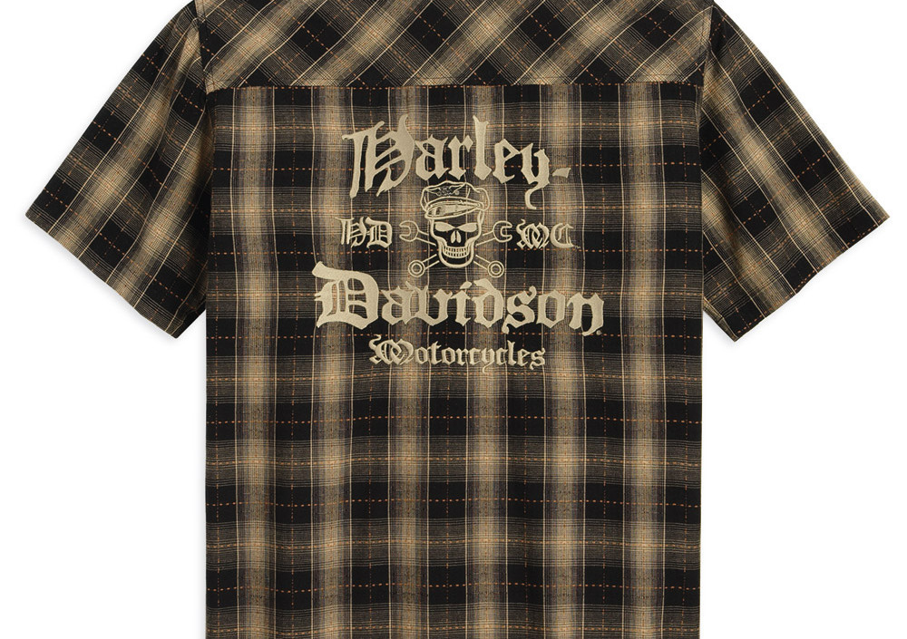 Camicia in puro cotone con collo dal taglio classico e chiusura a sette bottoni. Il capo dispone di due pratici taschini. Stampe Harley-Davidson percorrono questa proposta dal motivo scozzese.