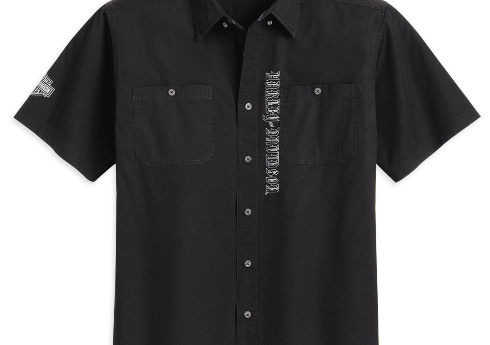 Camicia a maniche corte in puro cotone con chiusura a sette bottoni e due tasche. Gli orli sono in tonalità a contrasto. Grande protagonista della proposta è la stampa Skull firmata Harley-Davidson.
