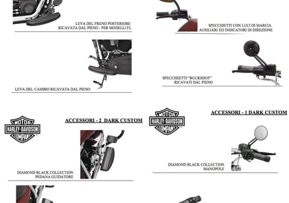 Della Collezione accessori Dark Custom fanno parte le manopole Diamond Black Collection, le pedane Diamond Black Collection, il pedale freno Diamond Black Collection, la pedana guidatore e passeggero Diamond Black Collection, le leve manubrio Flame, le leve manubrio Skull, gli specchietti neri satinati con luci di marcia ausiliari ed indicatori di direzione integrati, gli specchietti neri satinati “a cupola” ricavati dal pieno, la leva del freno posteriore e la leva del cambio ricavate dal pieno con finitura satinata nera.