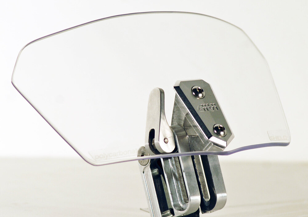 La terza proposta è un piccolo spoiler universale S180T SHIELD+. Presentato in anteprima alla fiera di Milano, ha attirato l’attenzione di molti appassionati. In breve, questo trasparente accessorio può essere applicato su cupolini e parabrezza tramite il pratico e sicuro sistema di ancoraggio in alluminio di cui è dotato, che allo stesso tempo permette di regolare inclinazione e altezza dello screen. Unica accortezza: verificare che il proprio parabrezza sia sufficientemente robusto da “ospitare” lo SHIELD+.