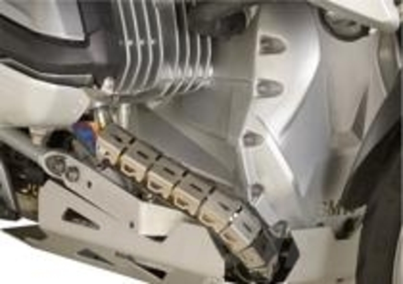 Praticamente una “extension” per il cavalletto laterale. Si chiama ES… (il resto della sigla identifica il modello di moto cui è dedicato) e amplia notevolmente la superficie di appoggio del veicolo, distribuendo meglio il peso scaricato sul terreno. In altre parole, evita le classiche cadute dovute all’asfalto rovente estivo oppure a fondo sconnesso o troppo morbido, strade bianche. Facile da montare, l’Extension stand è un accessorio piuttosto tecnico: la base sottostante è realizzata in alluminio, lavorato tramite frese CNC, spazzolato e anodizzato; la parte superiore in lamiera è ricavata da acciaio Inox 316 (garantisce il miglior livello di tenuta alla corrosione). Prezzi al pubblico dai 30 ai 35 euro.