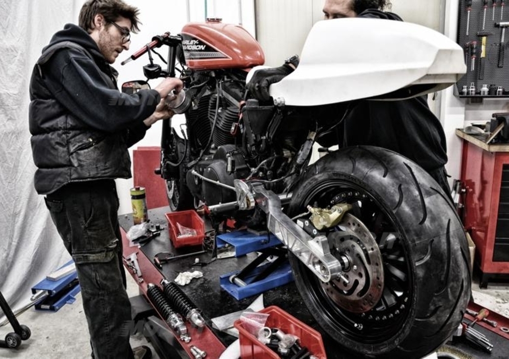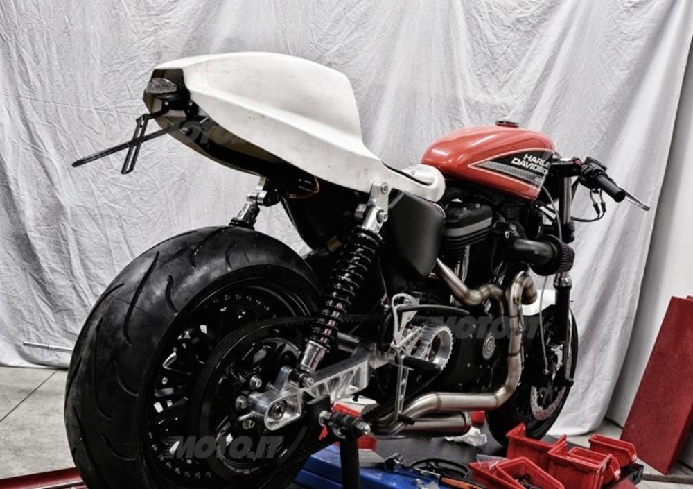 Nata con il preciso obiettivo di creare una moto dalle buone doti dinamiche, la 883R è stata completamente rivista nel comparto sospensioni, con una forcella dotata di kit pompanti (cod. 201206) ma soprattutto un retrotreno rialzato con risers-block (cod. 201213) ed ammortizzatori XR1200 forniti da Bitubo. Ottenuta così una geometria da café racer, con cannotto a 24°, è stato necessario ripristinare il corretto tiro cinghia riallineando perno ruota, pignone (disassato, cod. 207604) e perno forcellone grazie al tendicinghia (cod.207665) riducendo lo stress sulla trasmissione.