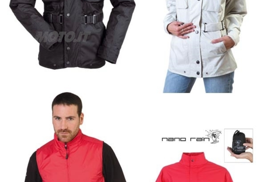 E’ a portata di tasca, borsa o sottosella la neonata linea “Nano” per chi non ama le sorprese del tempo. A inaugurarla è, nelle tonalità rosso e nero, la NANO RAIN JACKET (760 - 7 taglie S/4XL; LADY 761 - 5 taglie 38/46; 49,00 euro): giacca antipioggia supercompattabile, in nylon 100 per cento impermeabile e traspirante, che si richiude in una confezione a sacchetto di minimo ingombro, comoda per essere riposta nel sottosella o in qualsiasi borsa da passeggio, ed essere estratta e indossata alla prima avvisaglia di cielo scuro.