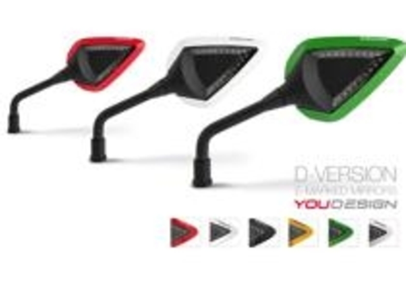 Rosso, Verde, Bianco, Carbon look, Silver, Gold e Nero sono i colori disponibili degli inserti. Della serie Youdesign fanno parte gli indicatori IDEA, i retrovisori D-Version, R-Version, ma anche i tamponi paratelaio e i Nottolini forcellone.