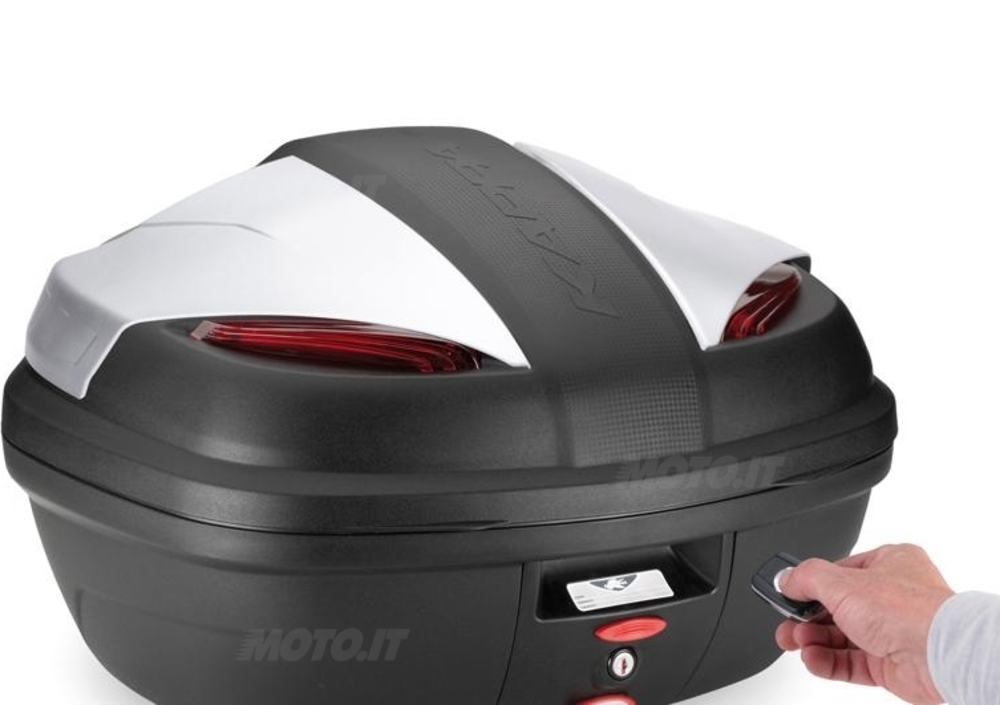 L’elenco comprende il kit luci stop a led, facilmente collegabile all’impianto elettrico del proprio mezzo (V108K,), un comodo schienalino in poliuretano in colore nero (K633) e il set di apertura del bauletto tramite telecomando dedicato (K132). I prezzi di questi accessori sono in via di definizione.