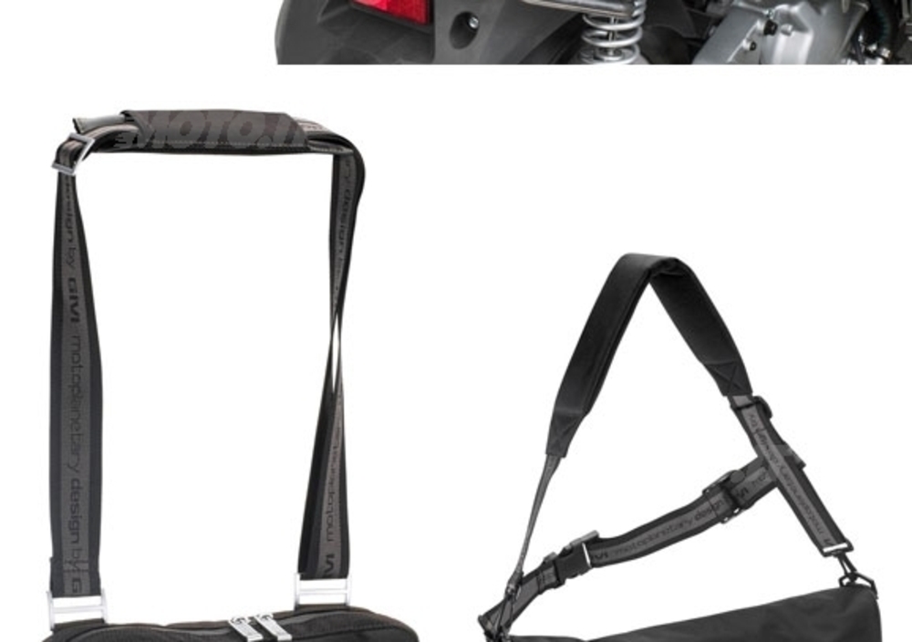 La T467 nasconde però un segreto, una prerogativa davvero interessante: attraverso una piastra universale (montata sul lato posteriore della borsa) essa può essere fissata a qualunque mezzo a due ruote munito di attacco GIVI Monolock o Monokey (in pratica l'80 per cento dei mezzi in circolazione). La T467 prende il posto del bauletto o della valigia laterale. Chi non dispone di un attacco GIVI può ovviamente acquistarlo come optional.