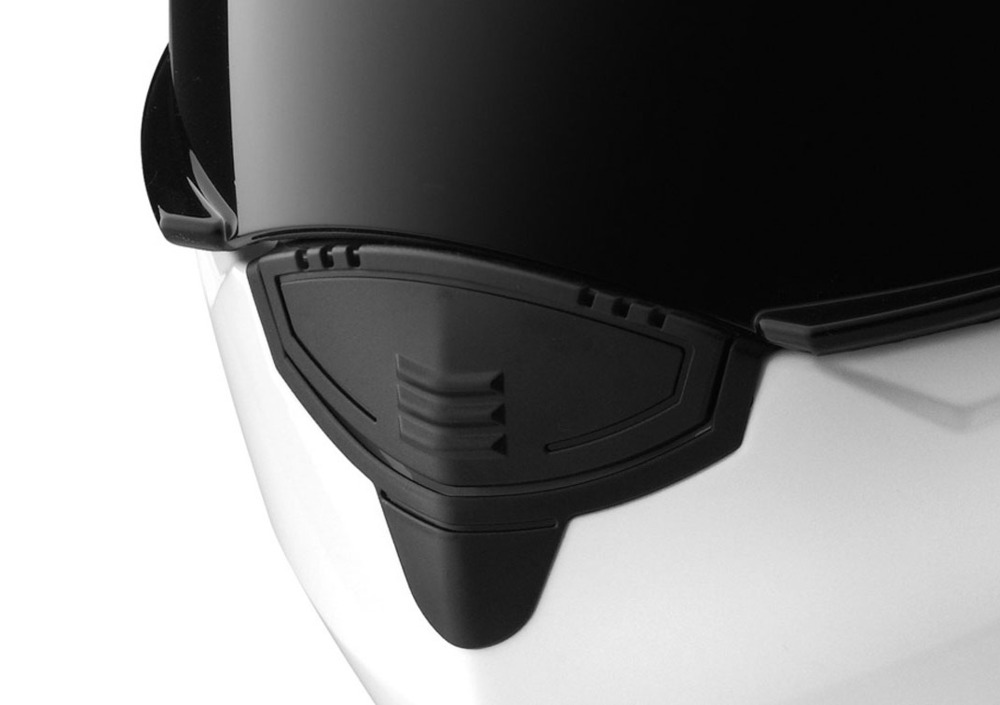 Il sistema di ventilazione – Il suo schema, ben visibile nella fotogallery, superiore consente un flusso ottimale di ventilazione all’interno del casco, e di estrazione dell’aria calda posteriore, anche viaggiando lentamente in città, grazie ad un profilo a spoiler posteriore con due estrattori, che crea un effetto sifone che alle alte velocità riduce anche il rumore. Il flusso d’aria che ventila il capo del pilota di una naked arriva a ben 8 litri d’aria al secondo a 100 km/h, il 12% in più rispetto al C3. Un’ampia presa d’aria sul mento aiuta ulteriormente ad eliminare l’appannamento.