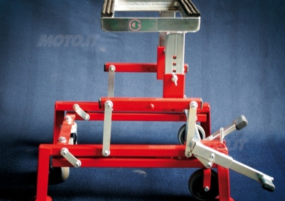 Sostegno moto regolabile in altezza da 220 a 350 mm. Il meccanismo di alzata 90 mm non è progettato su guide ma bielle che garantiscono totale stabilità.