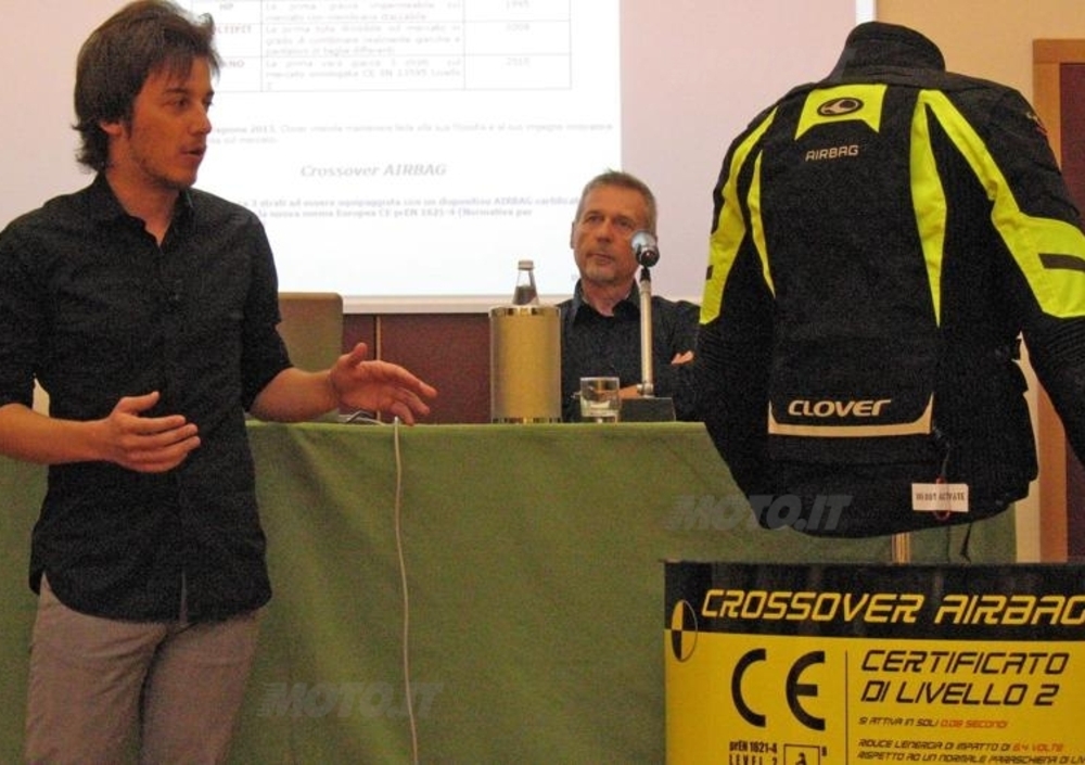 Milano, 27 settembre 2012 - Massimo Marchetto ha presentato alla stampa le novità della collezione Clover 2013. In cima alla gamma c'è un prodotto studiato e progettato per offrire sicurezza, comfort e vestibilità di altissimo livello. E' la nuova giacca Crossover Airbag, che racchiude una serie di anteprime uniche nel panorama dell'abbigliamento motociclistico contemporaneo. Così, dopo la giacca Tekno che nel 2010 fu la prima giacca 3 strati omologata CE EN 13595 Livello 2, oggi tocca al nuovo prodotto Clover stabilire un primato: Crossover è la prima giacca 3 strati equipaggiata con un dispositivo Airbag certificato di livello 2 secondo la nuova norma Europea CE prEN 1621-4 (normativa per dispositivi airbag provvisoria, ma in fase di approvazione presso l'Unionre Europea).