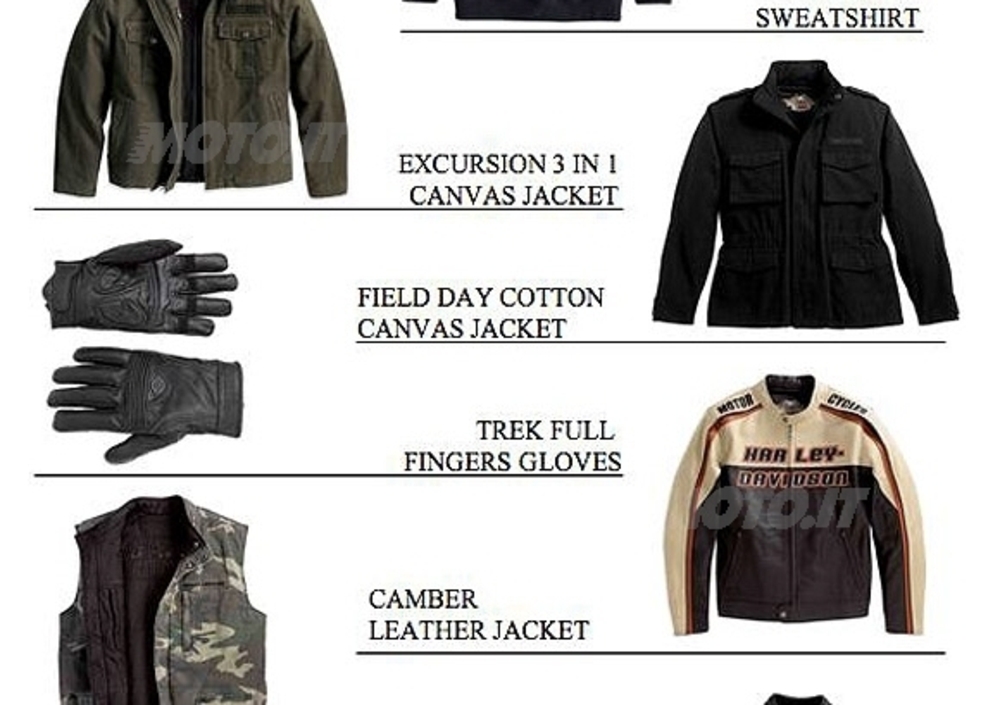 Predominante l’utilizzo del marrone, del nero, del verde olivastro e del blu, oltre che i più classici colori Harley-Davidson. La pelle è un must del periodo, proposta in molte versioni ed abbinata ad altri materiali. Significativo l’utilizzo degli strati componibili, accorgimento indispensabile nelle stagioni di transizione.