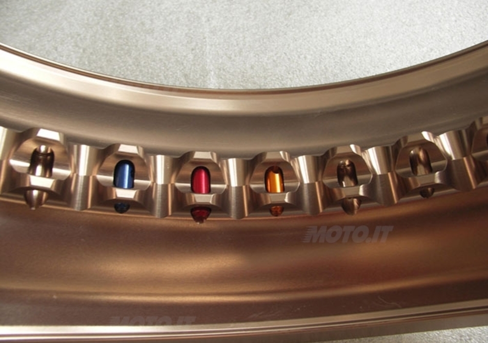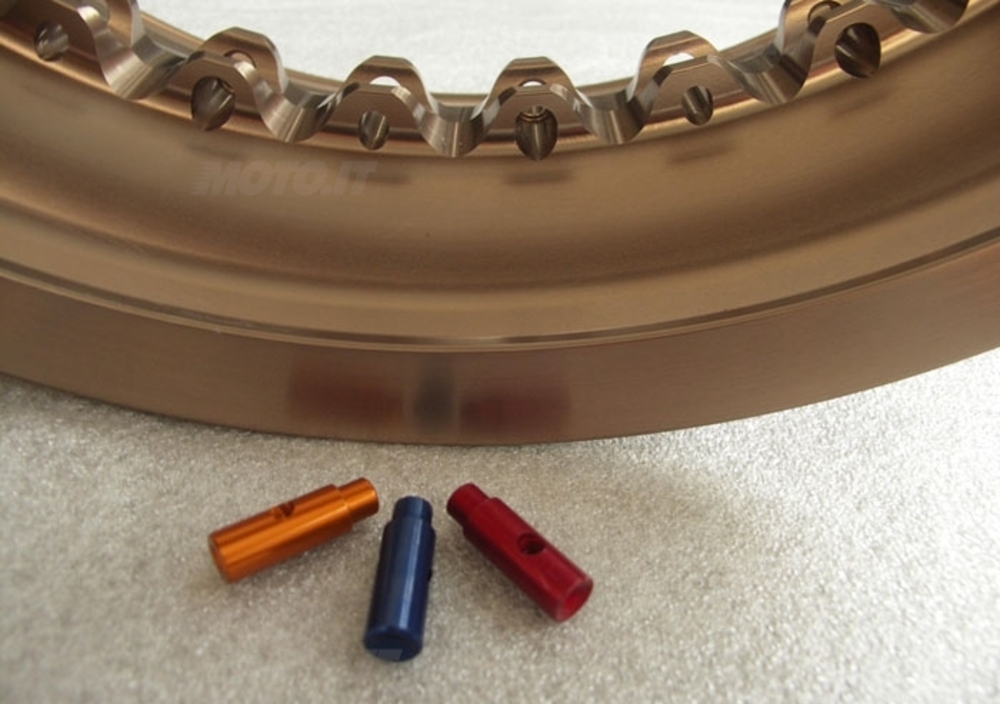 La geometria dei nippli rappresenta la principale innovazione della ruota tubless Kineo.Questi elementi, realizzati in lega leggera, vengono montati sul cerchio in posizione parallela all’asse della ruota, senza la necessità di dover prevedere dei fori passanti sul cerchio. Le varie colorazioni disponibili permettono di personalizzare la ruota in abbinamento alla colorazione della moto.