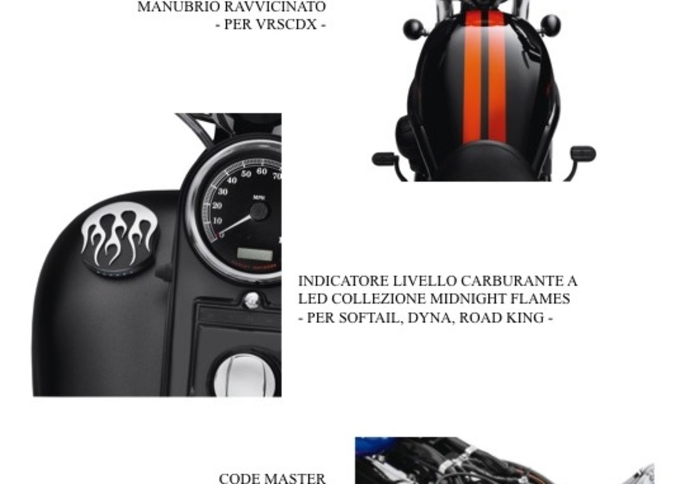 Nuovo indicatore di livello del carburante a profilo ribassato che sostituisce la lettura analogica. I sei LED blu luminosi installati sul bordo inferiore sono tutti accesi quando il serbatoio è pieno e si spengono uno dopo l'altro via via che il carburante diminuisce. L’installazione è plug-in senza la necessità di giunzioni. Questo accessorio fa da complemento al tappo del serbatoio Midnight Flames. Una fotocellula regola automaticamente la luminosità dei LED per migliorarne la visibilità alla luce diretta del sole e per attenuarla al buio. E’ adatto ai modelli Softail® prodotti dal '08 in poi, Road King® e Dyna® dal '09 in poi (escluso FXD).