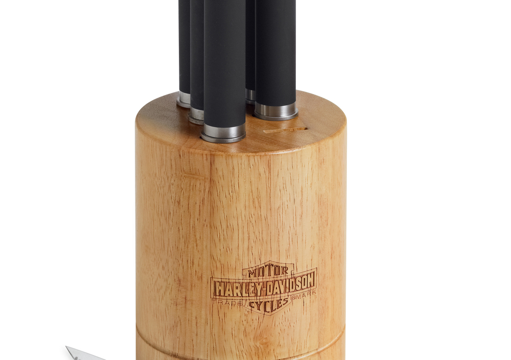 Metallo al 30%, plastica al 10% e legno al 60%. Ceppo di legno e set di sei coltelli con motivo stilizzato “valvola a farfalla”. Il logo Bar & Shield è inciso al laser in cima a ogni coltello e sul ceppo. Prezzo al pubblico consigliato Iva inclusa 83,00 Euro.
