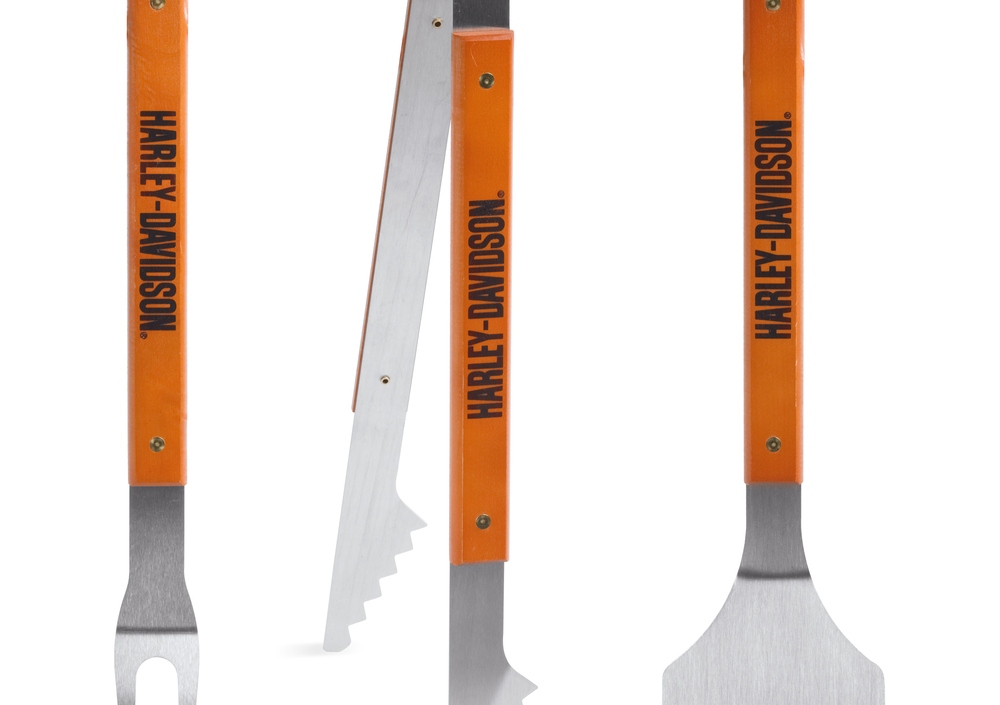 Set di tre attrezzi per barbecue: spatola, forchettone e pinza. L’impugnatura è in legno con stampa termica personalizzata Harley-Davidson. Gli articoli sono in acciaio inox con logo Bar & Shield inciso al laser. Le impugnature diventano all’occorrenza un comodo apribottiglie. Lavare a mano. Prezzo al pubblico consigliato Iva inclusa 83,00 Euro.