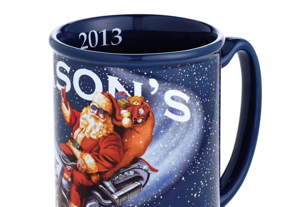 Tazza in ceramica da 16 oz. rivestita da una stampa natalizia: Babbo Natale in Harley-Davidson e anno 2013. Utilizzabile sia in lavastoviglie che nel microonde. Prezzo al pubblico consigliato Iva inclusa 28,00 Euro.