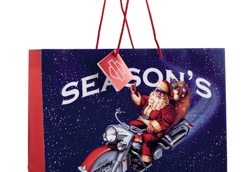 Capiente e resistente sacchetto di carta per i regali. Protagonista è Babbo Natale in Harley-Davidson completo di scritta augurale e dettagli glitterati. Il sacchetto include della carta per riempire e proteggere il contenuto e biglietto d’auguri in tema applicabile sui manici. Venduto in confezione da 6. Prezzo al pubblico consigliato Iva inclusa 8,00 Euro.