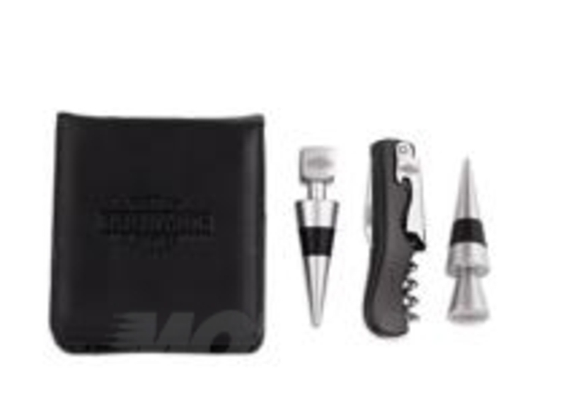 Set di accessori per il vino racchiusi in un’elegante pochette in pelle. Il set comprende un apribottiglie professionale e due tappi. Il logo Bar & Shield personalizza ogni articolo. Prezzo al pubblico consigliato Iva inclusa 42,00 Euro.