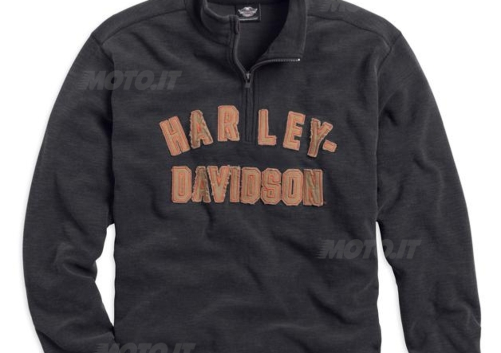 Maglia a maniche lunghe in puro cotone con speciale lavorazione a nido d’ape, collo alto e chiusura a zip corta. Protagonista è la scritta Harley-Davidson ricamata con taglio al vivo. Disponibile in