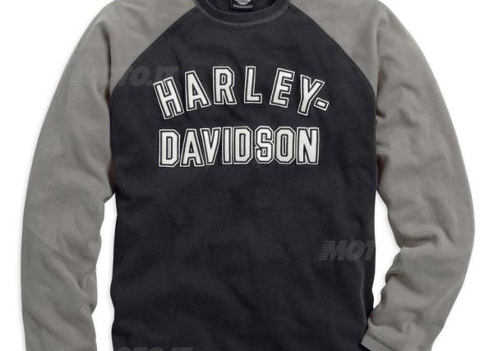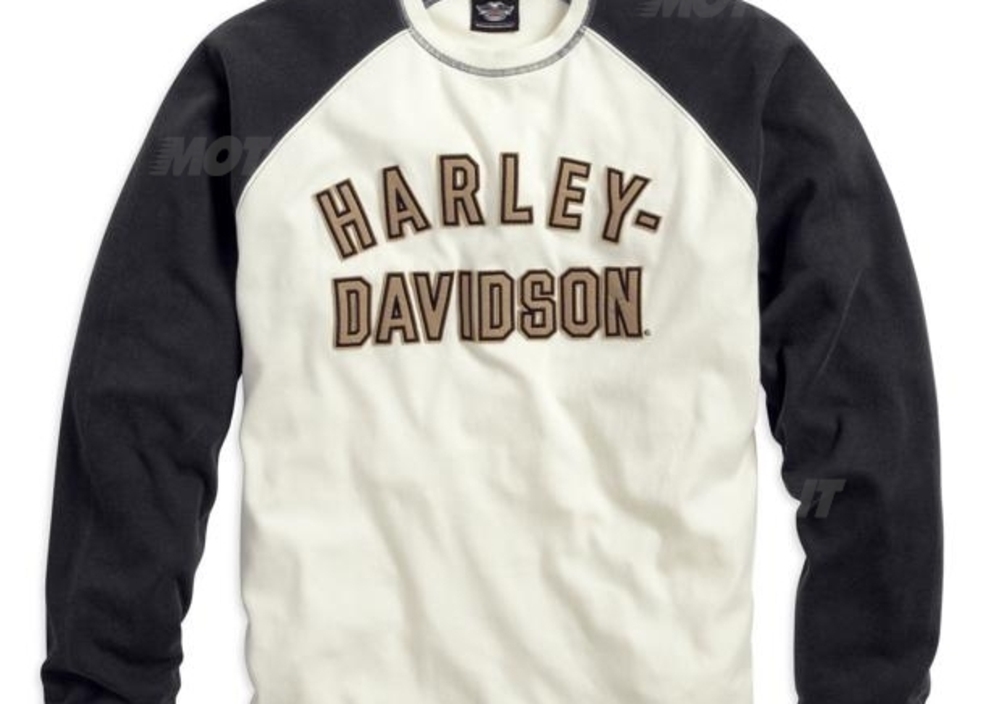 Maglia a maniche lunghe in puro cotone con trattamento intensivo di prelavaggio, caratteristica che ne determina una particolare morbidezza. La sportività del capo spicca dal gioco di colori a contrasto delle maniche. Forte richiamo alla storia del marchio è la scritta Harley-Davidson