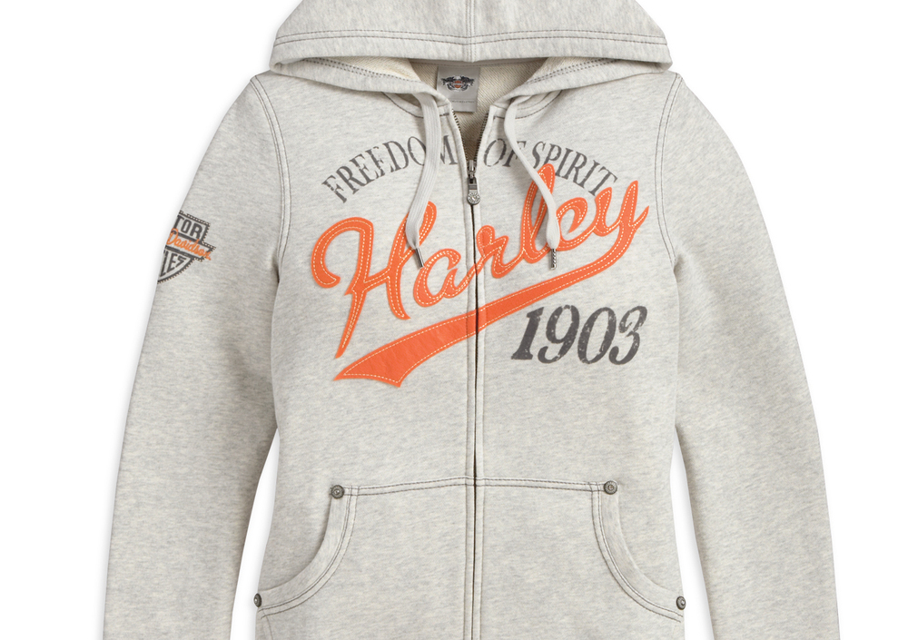 doppia tasca. Vita e polsini sono elasticizzati. Cuciture a contrasto, stampe Harley ed applicazioni