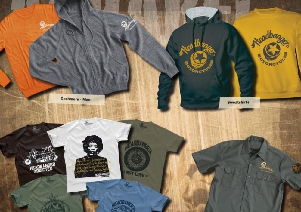 Diversi i capi della linea abbigl iamento pronti per la nuova stagione: una serie di t -shirts in puro cotone e in diversi colori (bianco, nero, azzurro, olive, khaki, charcoal), con grafiche particolari a rappresentare un netto richiamo ai mondi street e tattoo, ma anche un tributo a Jimi Hendr ix e Janis Joplin e, ovviamente, alle moto Headbanger.