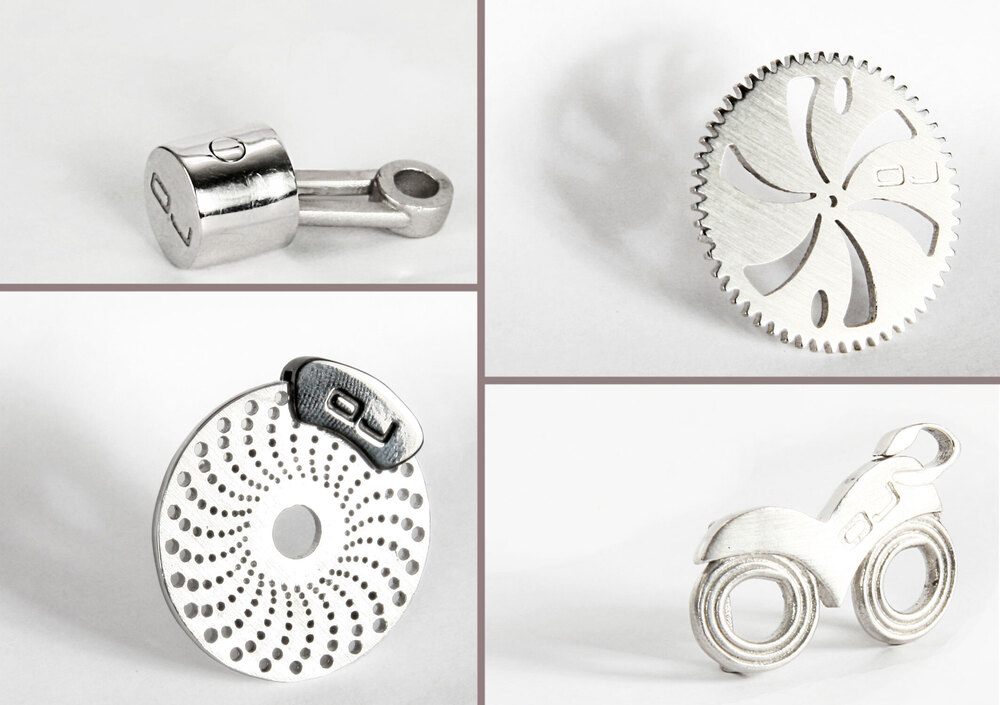 La collezione è interamente realizzata con metodo artigianale. Ogni singolo bracciale, leggermente differente da ogni altro, è numerato e corredato di certificato di proprietà e garanzia “made in Italy”. Il cinturino è in pelle lavorata a mano, i ciondoli sono prodotti in bronzo e raffigurano parti meccaniche della moto (4 soggetti, 5 modelli).