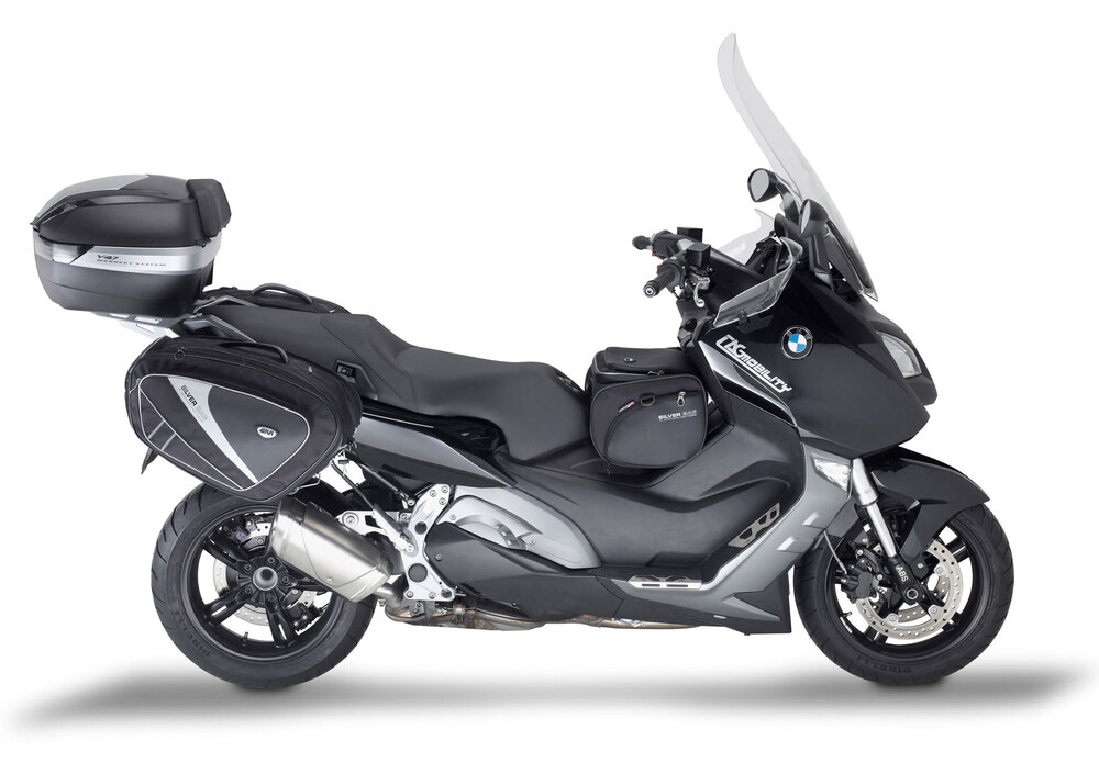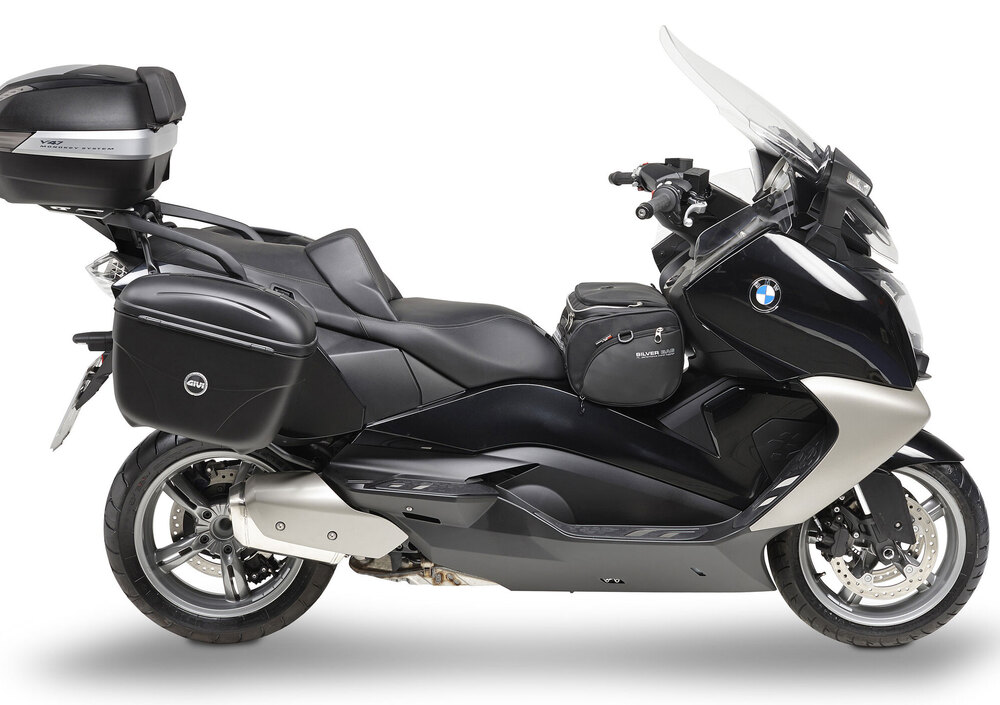 Il kit GIVI per il modello C 650 GT, comprende l’attacco posteriore SRA5106 (126,50 euro), per i top case della gamma MONOKEY, specifico e realizzato in alluminio anodizzato, al quale è possibile abbinare il portavaligia laterale PL5106 (156 euro), capace di supportare “le rigide” della gamma MONOKEY (perfette le E21 nere, in foto, a 131 euro la coppia).