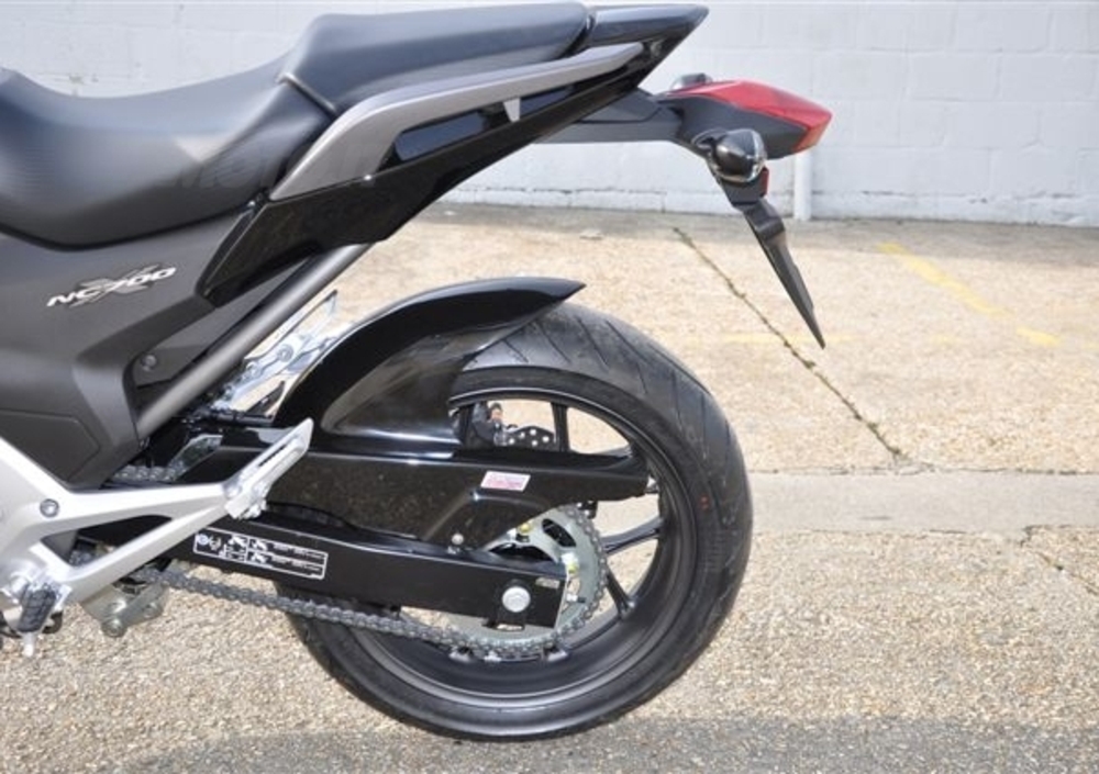 L’ammortizzatore posteriore della NC700X è molto esposto alle intemperie e il parafango è di grande aiuto per tenerlo pulito ed in efficienza soprattutto nei lunghi viaggi. Il parafango posteriore con il copricatena viene sempre fornito con viteria in acciaio inox con protezione per l’ammortizzatore; esso viene fornito in vetroresina nera non verniciata ma con un ottima finitura lucida.
