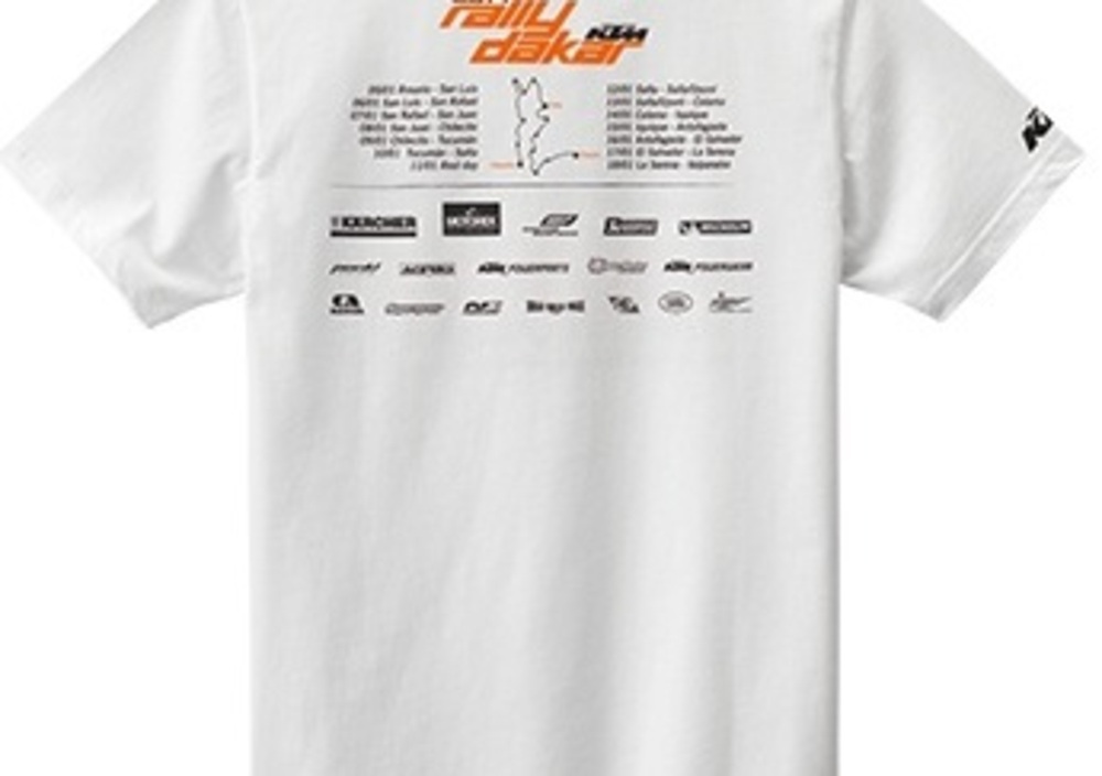 La maglietta è come sempre arricchita con grafiche “Ready to Race”. Realizzata in cotone bianco, sulla parte anteriore vede stampato il logo KTM rigorosamente arancione con la scritta celebrativa “Rally Dakar 2014” e la cartina che riproduce il percorso di gara abbinato alla nuova 450 Rally. Sulla schiena viene ancora riportato il percorso con tutte le 13 tappe e gli sponsor tecnici del Factory Team KTM.