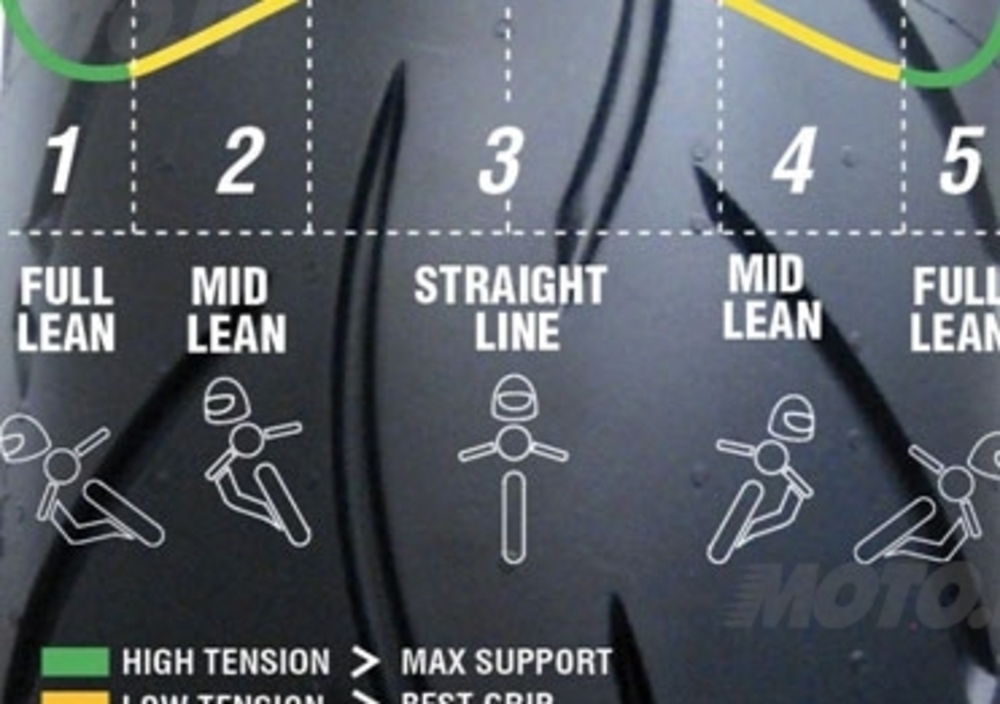 perfetta ottimizzazione dell’area totale d’impronta ad ogni angolo di piega, con un incremento delle prestazioni dell’8%, oltre che un miglioramento del profilo e della pressione di distribuzione. Un tale risultato si riflette in ogni condizione: stabilità più elevata su rettilineo, accresciuta sensazione di contatto nella fase centrale della curva, grip più sicuro in piena curva.