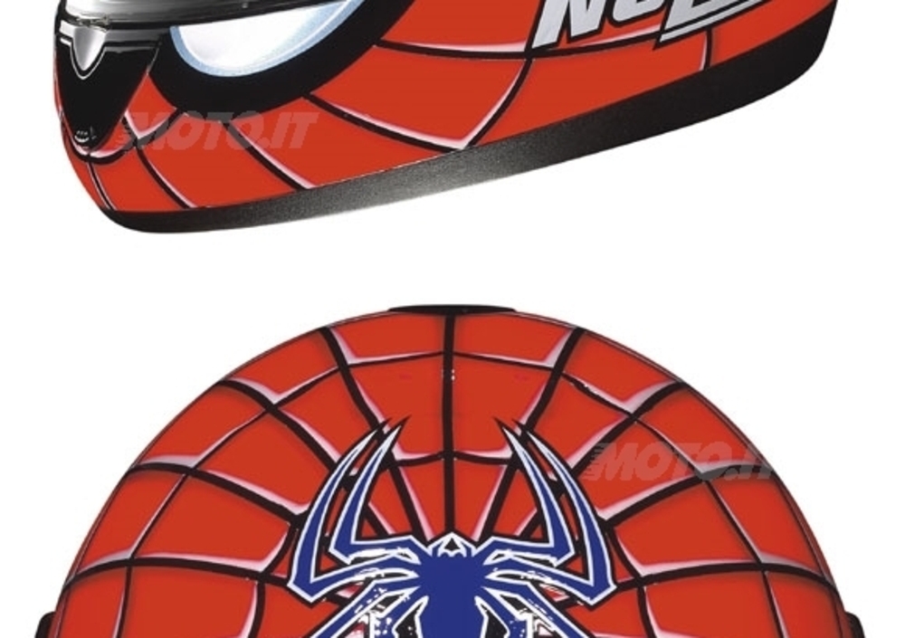 Il casco N61 Spider-Man 2 riproduce la maschera del super-eroe: un gigantesco ragno tesse la sua tela avvolgendo tutta la calotta sino alla visiera, dove culminano i due occhioni bianchi.