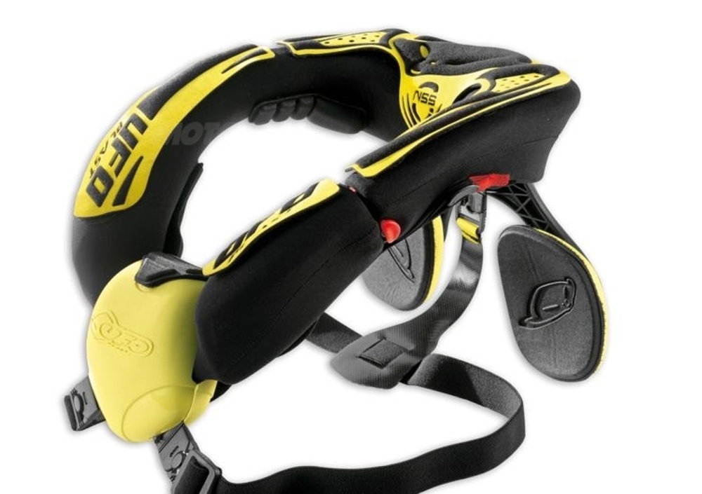 Un processo che conferisce caratteristiche strutturali adeguate per la necessità e al tempo stesso assicura un confort ottimale, lo sviluppo ergonomico del prodotto e le proprietà del PU espanso assicurano un ottimo assorbimento agli urti e un’ininfluente interferenza con il collo in caso di contatto. L'attacco laterale permette di indossare l'NSS con estrema facilità e in totale autonomia, anche con il casco indossato. Un'efficace sistema di sicurezza consente il mantenimento della chiusura in caso di urto.
