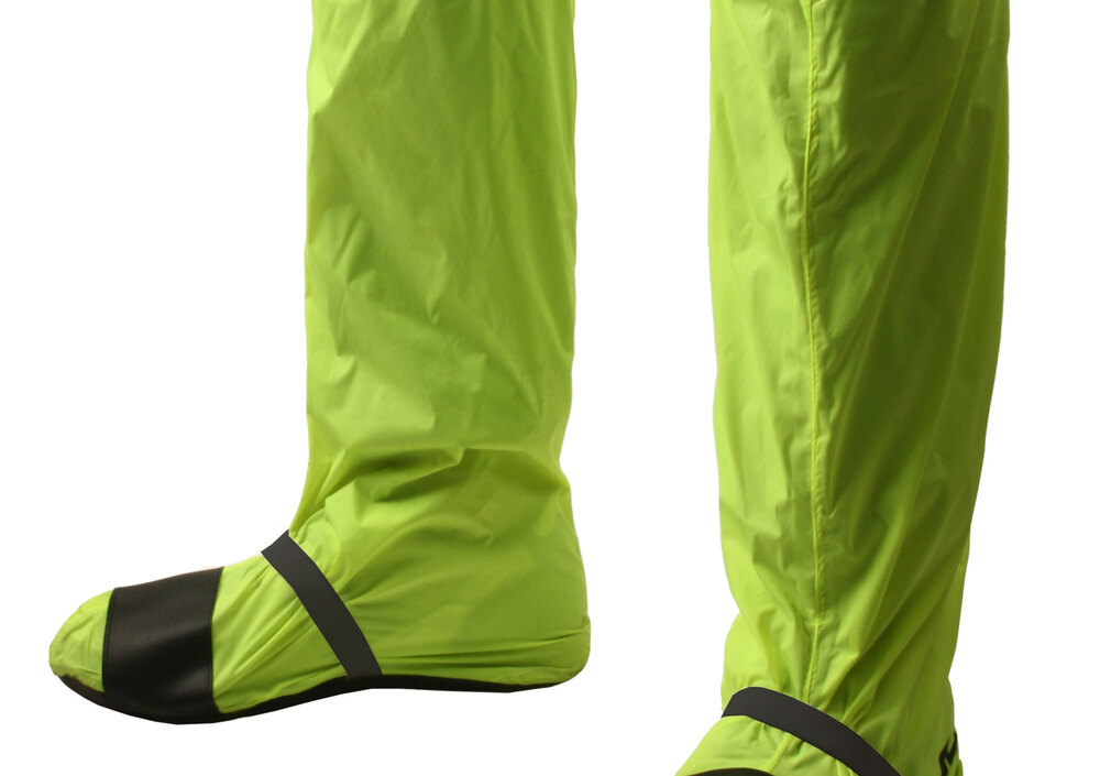 Questi ultimi sono realizzati in poliammide ultralight e possiedono una suola morbida antisdrucciolo con patch protettiva in PVC in zona leva cambio. L’impermeabilità è garantita da cuciture nastrate. Il capo è compatto e facilmente ripiegabile (sta in una tasca). Un elastico ottimizza l’aderenza tra copri scarpa e calzatura.
