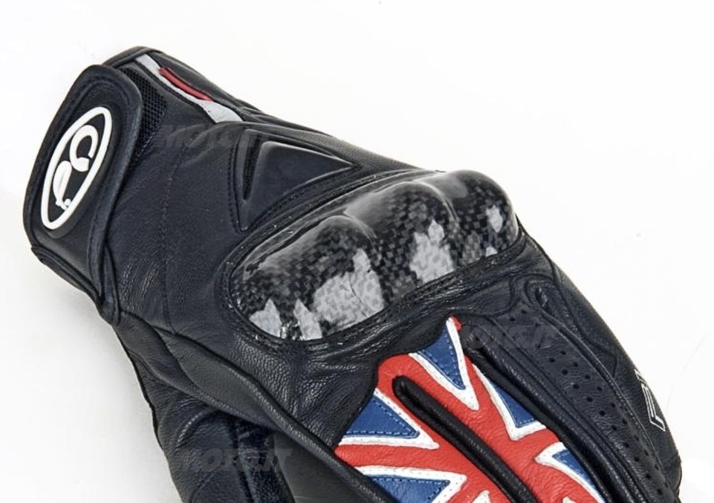il taglio corto, la costruzione in morbida pelle con rinforzi sul palmo e sul fianco, le cuciture rovesciate, l'efficace protezione in fibra di carbonio sulle nocche.
