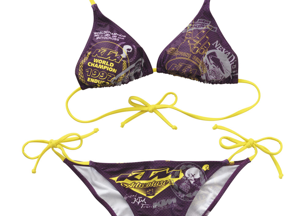 Bikini: bikini a triangolo color porpora con stampe “allover” offroad, laccetti color giallo fluo e coppe leggermente imbottite. Taglie XS - XL. Prezzo Euro 46.