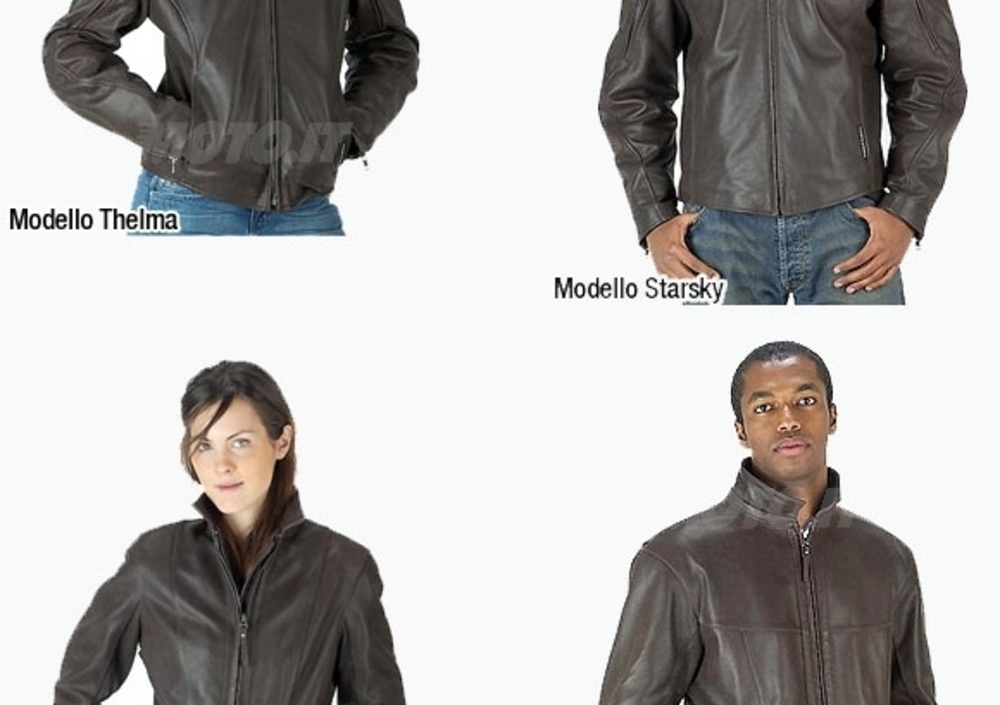 STARSKY (per lui) e THELMA (con taglio femminile per lei): giubbotto in stile pilota anni Cinquanta, ma con tutti i comfort più all’avanguardia. Cerniere anteriori e posteriori per una maggiore aerazione, imbottitura protettiva sulla schiena, predisposizione per le protezioni sulle spalle, protezioni rigide CE estraibili sui gomiti, tasche basse con cerniera interna, tasche portadocumenti interne. Effetto antimacchia, in caso di pioggia.