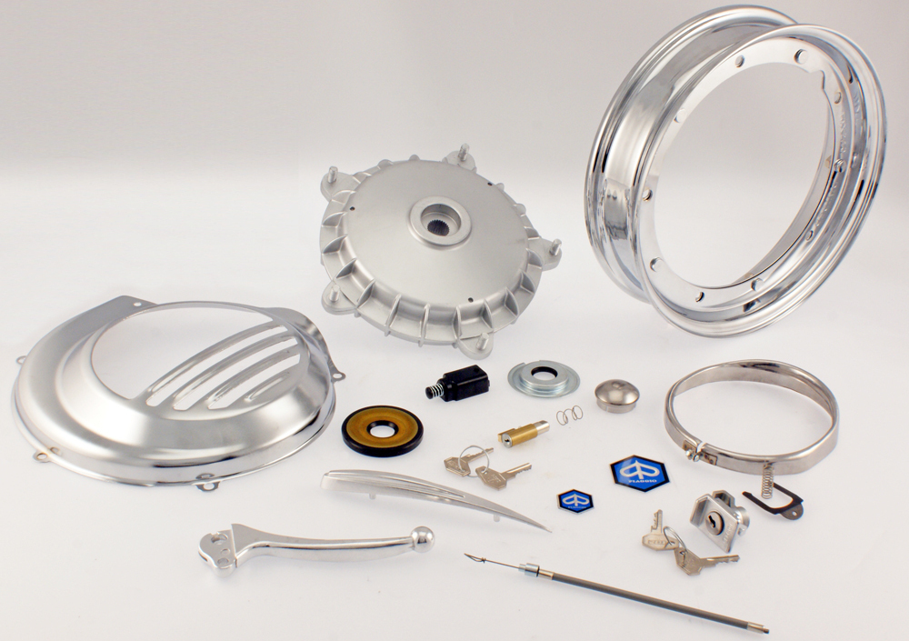 In particolare vengono mostrati un cerchio cromato Vespa (a breve seguito dalle versioni in nero lucido e bianca), una coppia di profili in acciaio lucido per modelli Vespa degli Anni 60, tamburi freno in alluminio verniciato e relativi tappi in acciaio, e ancora le serrature Zadi dello sterzo e del bauletto, con chiavi in metallo identiche alle originali. Non mancano dal catalogo RMS i set trasmissione con cavi e guaine grigie spiralate in ferro, adattabili alle datate versioni Vespa più comuni.