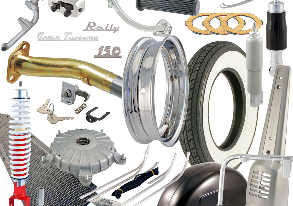 Scorrendo le pagine l’appassionato potrà scovare davvero di tutto: cuffie motore, calandre sterzo, griglie cromate, spie olio, targhette, kit trasmissioni guaine, cavalletti, coperchietti vari, ammortizzatori, cerchi, pneumatici, commutatori luce, cuscinetti, alberi motore, parafanghi, profili… un elenco lunghissimo che può continuare a lungo e che verrà implementato a brevissimo con altri elementi (fanaleria, tappetini, selle…).