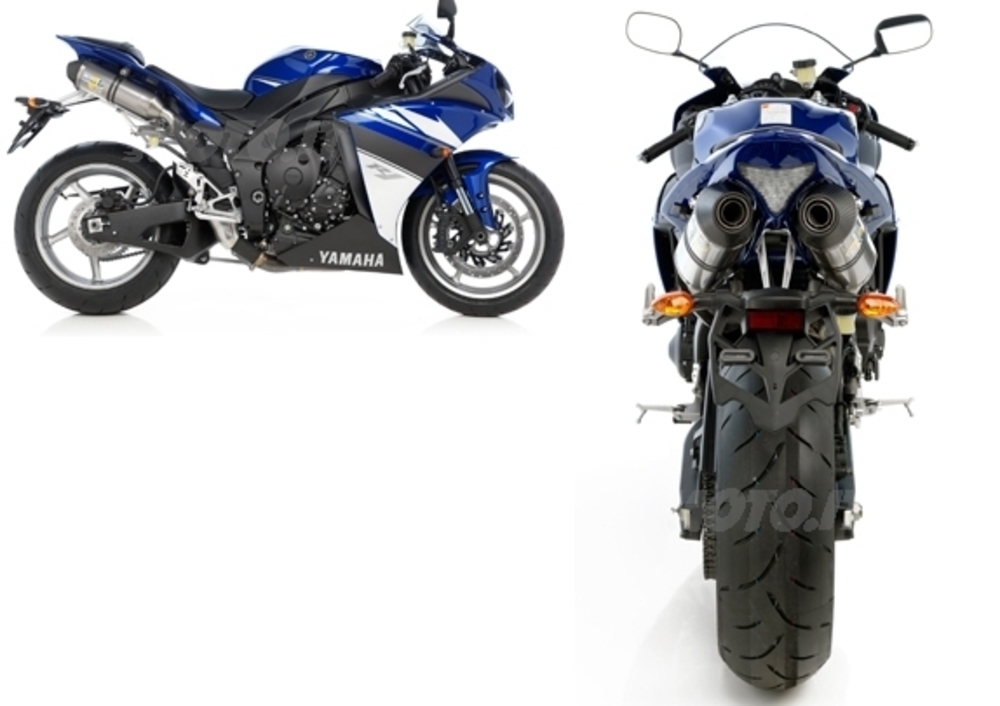 Corpo silenziatori in full titanio con coppa d'uscita e fascetta di ancoraggio al telaio in fibra di carbonio. Carter di protezione stivale in fibra di carbonio.