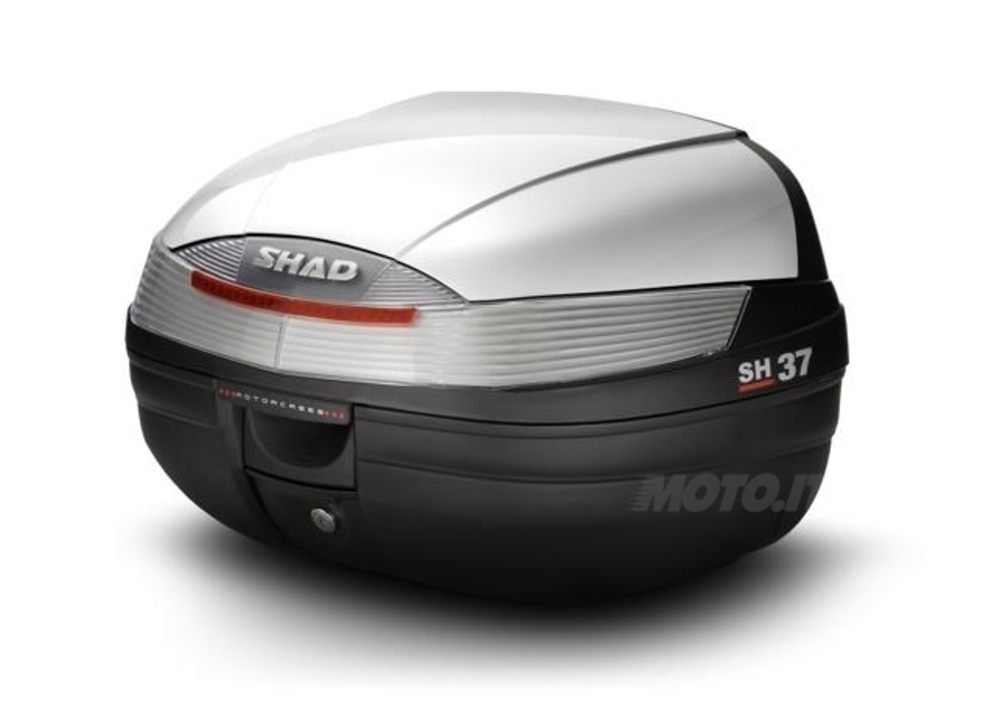 Il bauletto SH37 può contenere un casco integrale e può essere arricchito con diversi optional. Optional: cover colorate intercambiabili (Euro 35,80 IVA inclusa), schienale imbottito per il passeggero (Euro 14,97 IVA inclusa) e luce di stop a led (Euro 28,04 IVA inclusa).