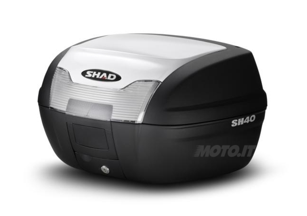 Il bauletto SH40 può ospitare un casco integrale e un casco jet e può essere arricchito con diversi optional. Optional: cover colorate intercambiabili (Euro 29,80 IVA inclusa), schienale imbottito per il passeggero (Euro 14,97 IVA inclusa) , luce di stop a led (Euro 31,25 IVA inclusa), e piastra “Cargo” (Euro 31,70 IVA inclusa), che permette di aumentare il carico nella parte superiore del bauletto.
