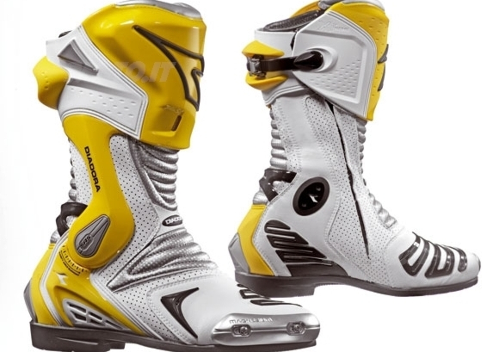 Il modello Xtreme ha ottenuto ampi consensi sia tra i motociclisti che tra i piloti che lo hanno utilizzato nei più importanti campionati mondiali su pista. Nella collezione 2008 Diadora propone ora l’Extreme Air, una versione da pista più areata ed estiva dell’Extreme. Xtreme Air si avvale dell’esclusivo sistema di piegamento SAS “Safety Ankle Support” con sistema di flessione gradiale, che impedisce movimenti innaturali della caviglia. La dotazione di sicurezza di questo stivale si completa con i rinforzi interni in poliuretano, le plastiche protettive iniettate e sagomate, l’inserto tallone in plastica rinforzata, e le plastiche iniettate sulla tomaia nella zona del cambio marcia, della caviglia e della punta. La tomaia è in microfibra areata e la ventilazione è garantita anche dalle prese d’aria inferiori. La fodera è in Air Mesh traspirante, il paracordolo sostituibile è in magnesio, mentre la perfetta personalizzazione della calzata è garantita da ben tre tipi di chiusure: la chiusura con zip, velcro e la regolazione posteriore con leva micrometrica. Il nuovo sottopiede Dual Flex è in TPU con imbottitura anti-shock in EVA e presenta un’area flessibile nella parte frontale, per la massima sensibilità nella zona del cambio marcia e comfort della camminata, ed un’area più rigida nella zona posteriore, per un’ottima stabilità del piede nel contatto con le pedane della moto. La suola racing personalizzata Diadora by Skywalk® è in gomma a tripla densità, antiscivolo e resistente agli idrocarburi. La suoletta interna, antibatterica e sostituibile, è dotata di APS (Air Pump System). Il sistema APS funziona tramite una speciale camera d’aria posta nella parte centrale della suola che, durante la camminata, sposta l’aria nella parte inferiore o superiore della suoletta stessa, consentendo all’utilizzatore di appoggiare sempre il piede su un cuscinetto d’aria che attutisce ed ammortizza il peso del corpo. Xtreme Air è disponibile nella colorazione bianco-giallo e le taglie disponibili vanno dal 38 al 47.