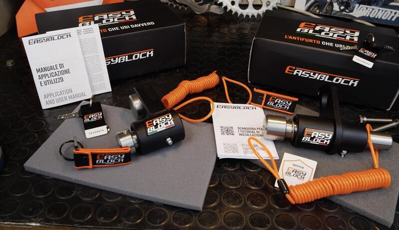 Ne avevamo parlato qualche anno fa, ma ora EasyBlock si è evoluto per essere ancora più efficace e resistente. Realizzato secondo la tecnica della scansione 3D per ogni singola moto o scooter verso cui è disponibile e successivamente attraverso prototipi realizzati e testati per garantire una perfetta integrazione con ogni singolo modello di moto o scooter, è un vero deterrente. Il bello è che va installato in modo permanente rimanendo sempre agganciato alla moto, sempre pronto all’uso. Una volta azionato blocca la ruota posteriore grazie ad un pistone in acciaio inox di grande diametro che impedisce al ladro di portarsi via la preda. Il corpo è in acciaio ad alta resistenza con verniciatura a polvere anticorrosione, per un'estetica impeccabile e duratura nel tempo. Per la moto offre anche una borchia in acciaio inox che protegge il dado del perno ruota posteriore impedendone la rimozione e quindi evitando che si eluda il sistema.