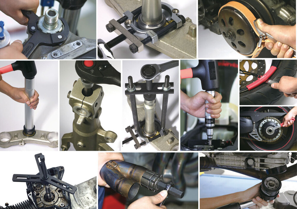 Pensati per il meccanico e per l’utente evoluto, i set di Bikeservice migliorano tempi e modi d’intervento su motore, telaio, sospensioni, freni, circuiteria elettrica, ruote.