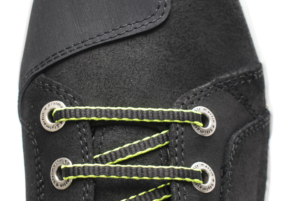 La SEATTLE EVO è proposta esclusivamente in nero, con finitura vintage. La personalizzazione è demandata ai lacci, forniti di serie in due varianti: giallo fluo e used grey. Un ulteriore tocco di giallo ad alta visibilità si ritrova nel reflex posteriore.