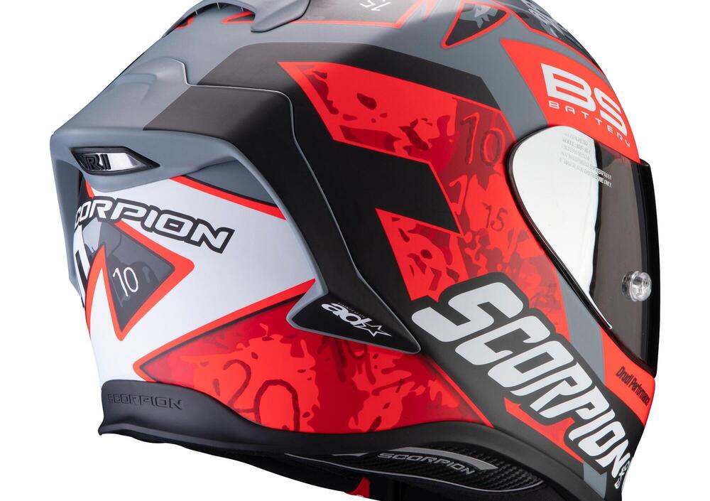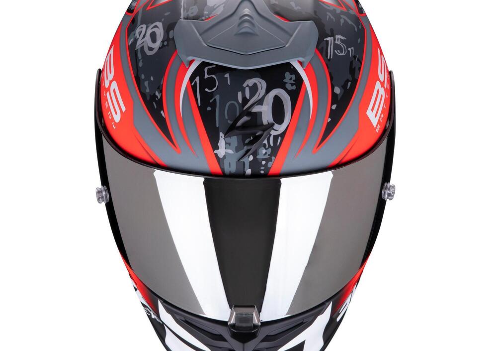La presa d’aria superiore (con molla di tensione apribile tramite un semplice tocco) è di grandi dimensioni ma con un profilo basso così da sposarsi con le curve aerodinamiche del casco. La grande quantità d’aria catturata viene riversata all’interno e poi scaricata dall’estrattore posteriore in modo da generare un carico aerodinamico (spinta verso il basso) per una guida ancora più stabile alle alte velocità.
