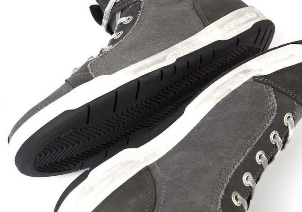 Stabile durante la guida e in camminata, Sunset EVO si caratterizza per il taglio che copre la caviglia e la suola in gomma antiscivolo bicolor bianco/nero con effetto muffato, volutamente vissuto.