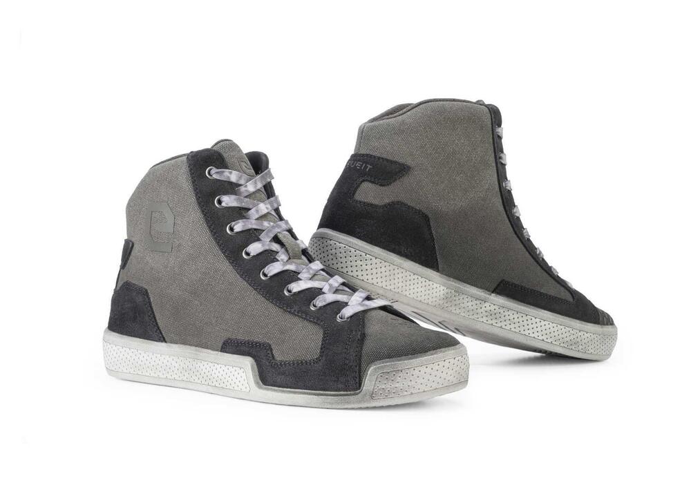 A catalogo la nuova sneaker tecnica è disponibile in un’unica colorazione grigio, con inserti in pelle scamosciata di colore antracite mentre la suola e i lacci sono di color bianco con trattamento invecchiato. Nella parte laterale il logo del marchio veneto in colore tono su tono e la scritta Eleveit nella parte posteriore completano il design delle nuove Antibes AIR Canvas.
